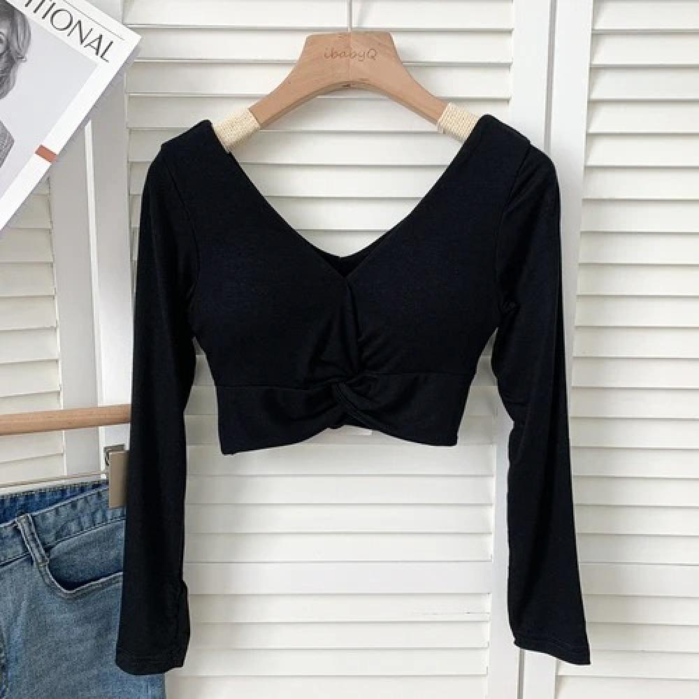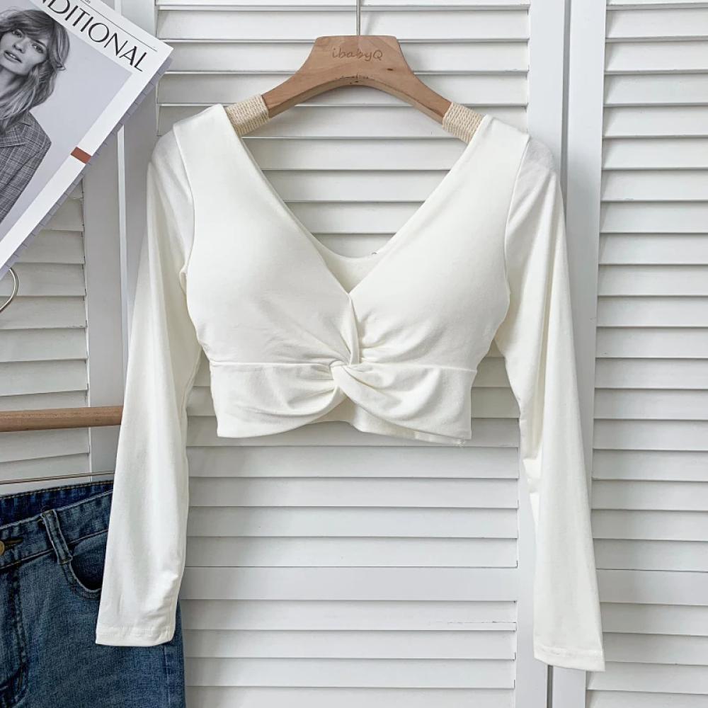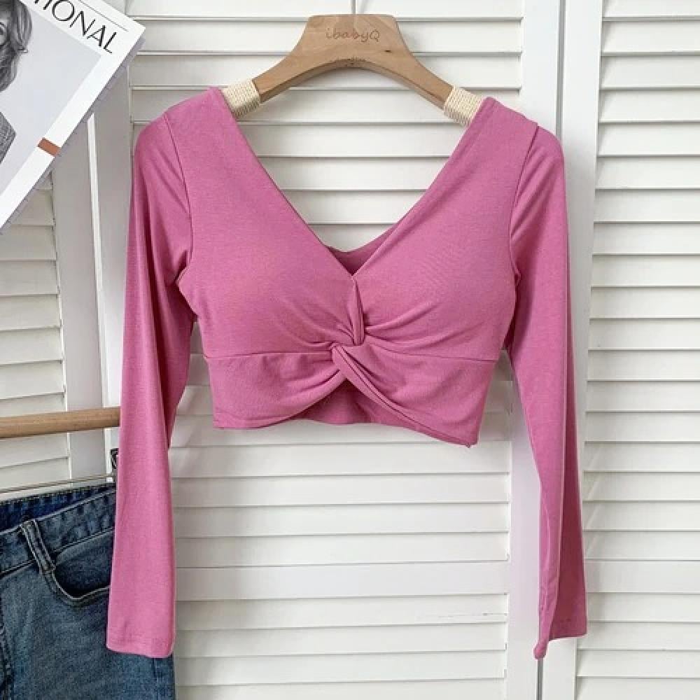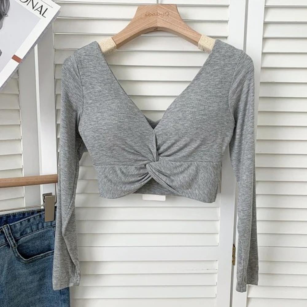 تي شيرت حريمي قصير بأكمام طويلة مع حمالة صدر مدمجة