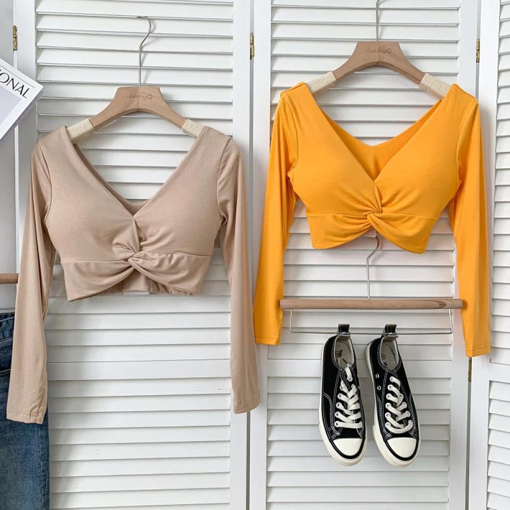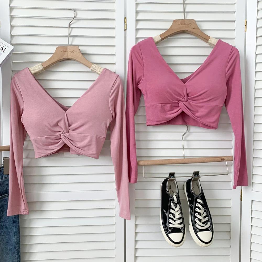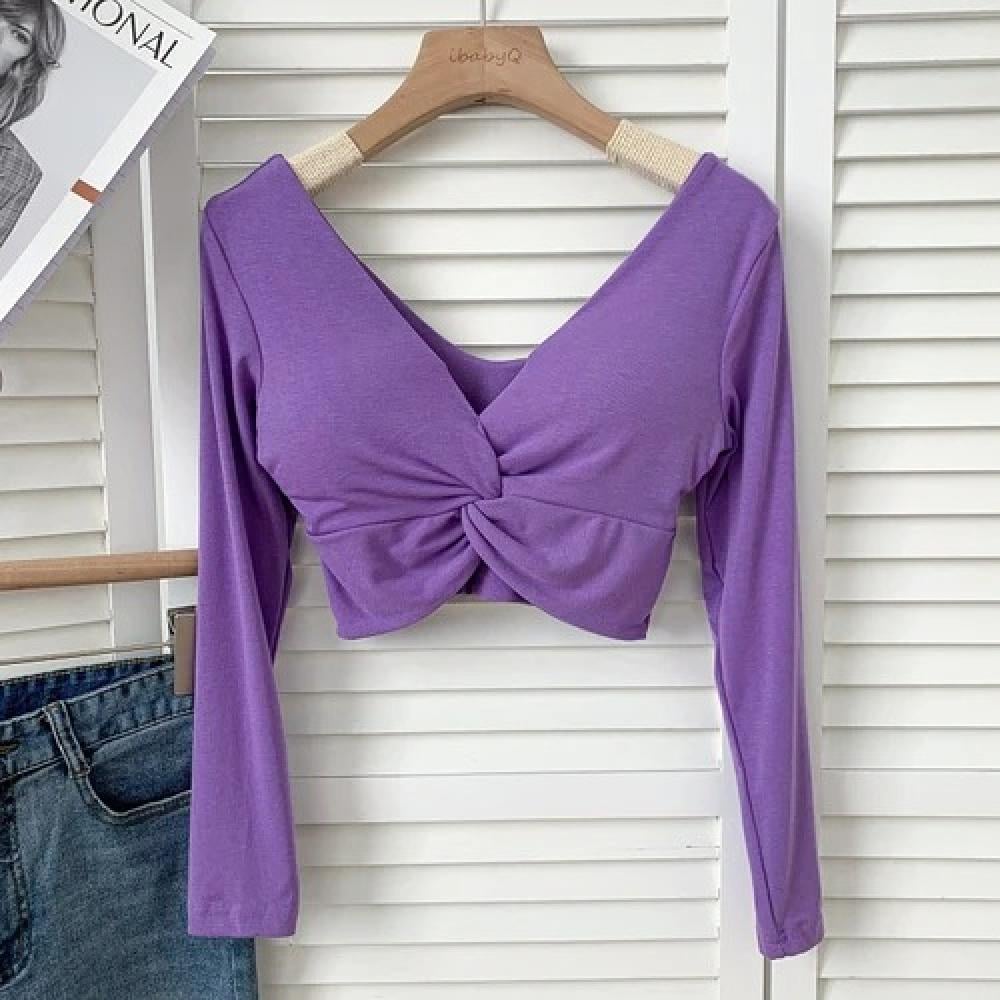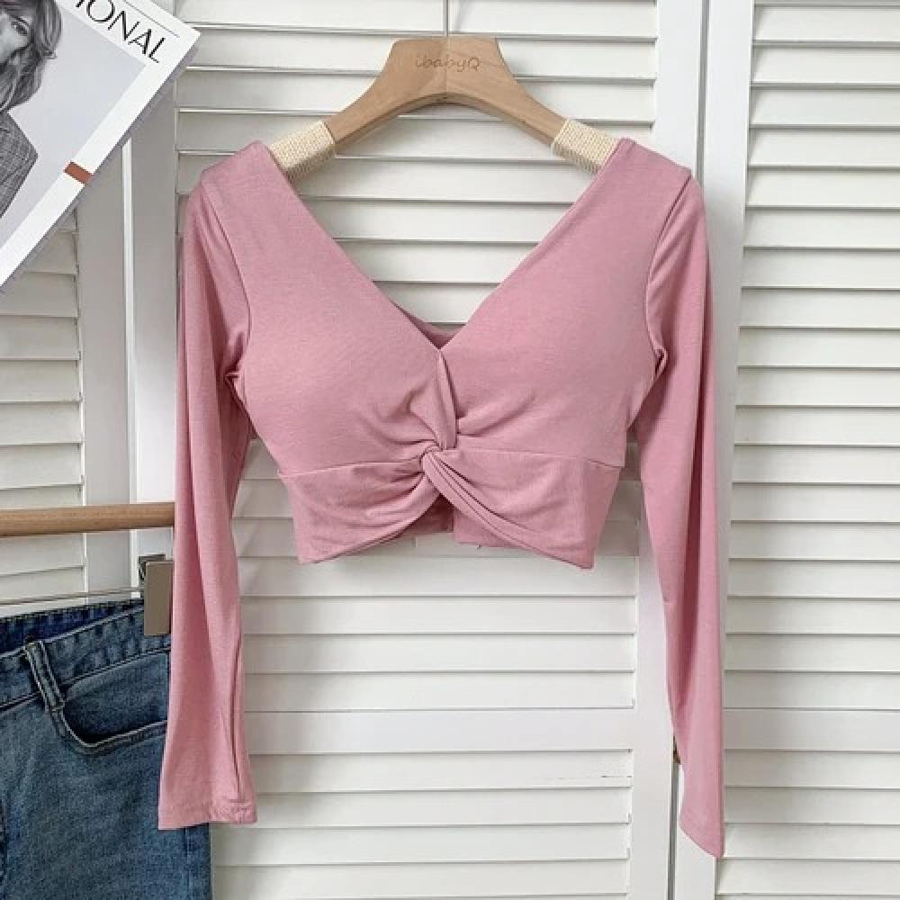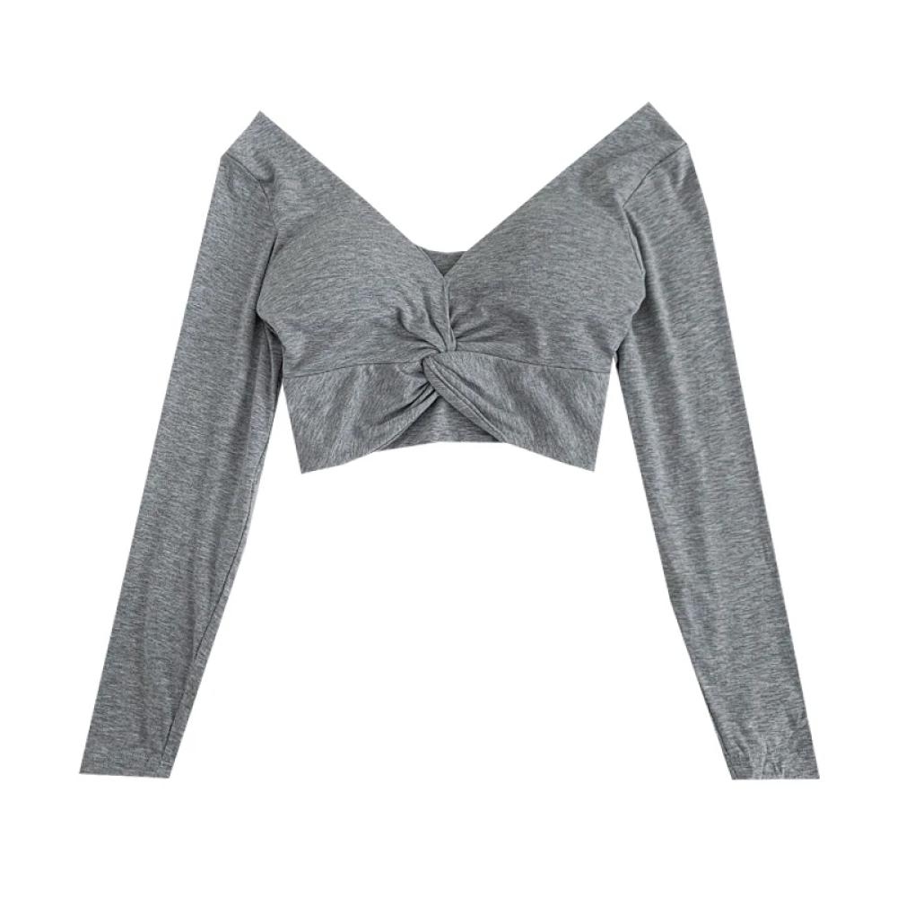 تي شيرت حريمي قصير بأكمام طويلة مع حمالة صدر مدمجة