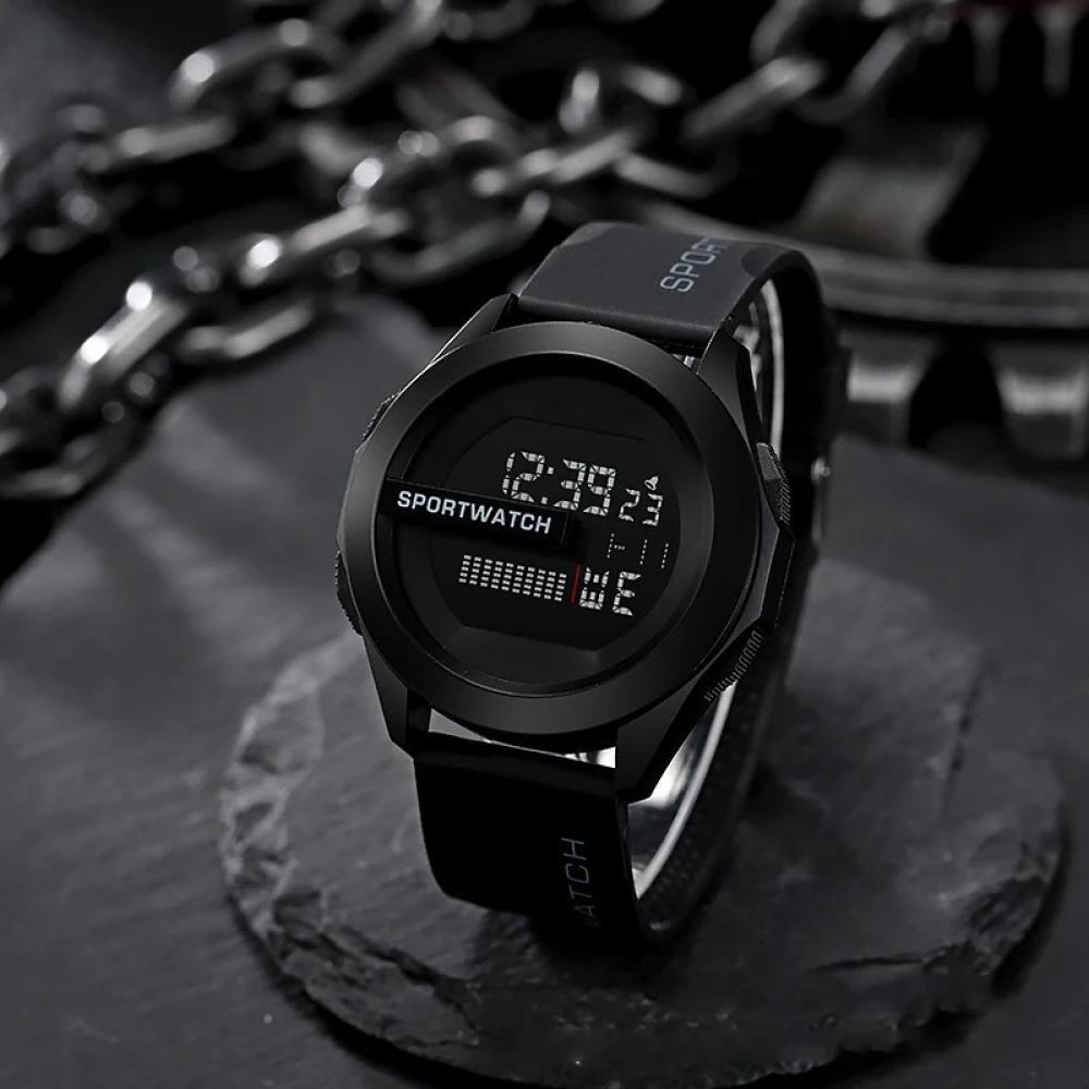 ساعة رياضية بوشي مقاومة للماء للرجال، تتميز بتصميم يد رقمي فاخر، وتضم ميزة توقيت مضيء مع عرض تاريخ الأسبوع. الساعة أصلية